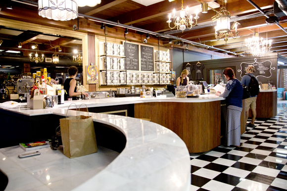 It looks like an upscale retro hotel lobby, with its gorgeous black-and-white patterned tile floor, comfortable reading chairs, dozens of tables and ornate living room with fireplace off to the side.