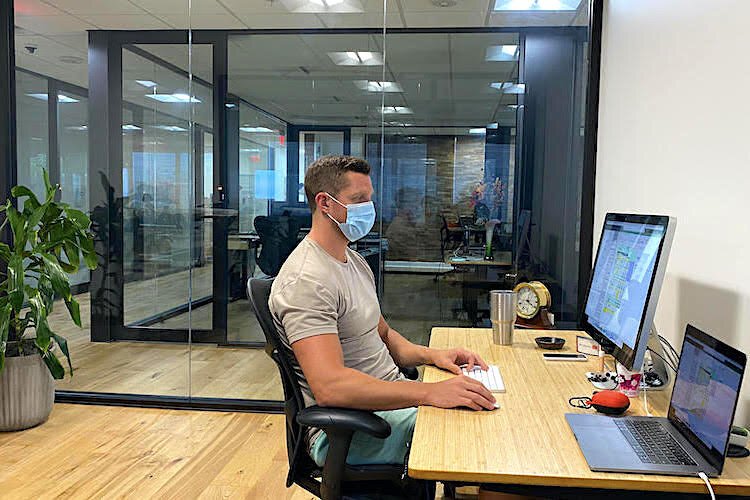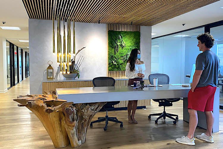 Courtesy of The Ring – Festus Porbeni of The Ring and Dina Arvanitakis of Arvanitakis Law Group coworking and practicing social distancing at work in Clearwater.