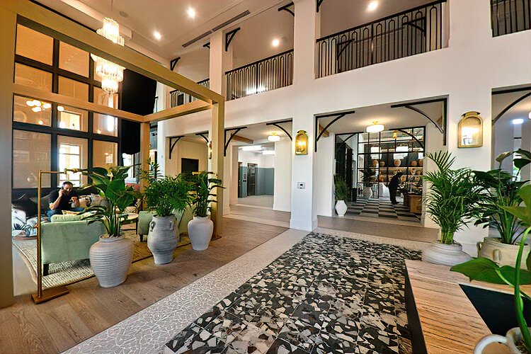 Besides the ornate and spacious first-floor common area, amenities at La Unión include a resort-style pool with private cabanas, landscaped courtyards, a two-story fitness area, a large co-working space and a pet spa.