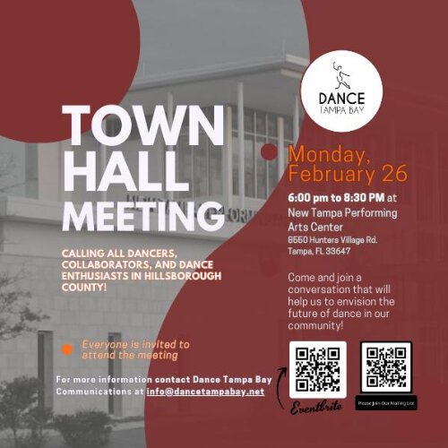 Out of the gate, Dance Tampa Bay is holding a trio of town hall meetings in February and March to get input from dance professionals, collaborators and enthusiasts on their priorities moving forward. Those sessions are February 26th at the New Tampa Performing Arts Center; February 28th at the Hillsborough Community College Ybor Campus dance studio; and March 26th at The Walton Academy. Each town hall is scheduled from 6 p.m. to 8:30 p.m.