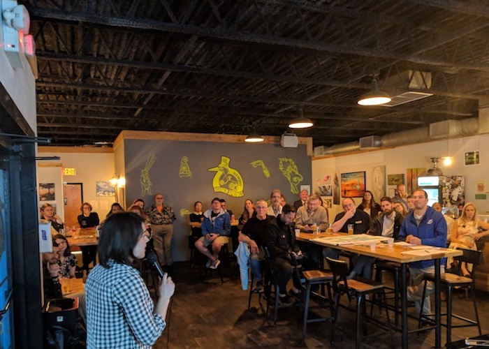 The Urban Charrette and Congress for New Urbanism Tampa Bay Chapter – Ali Ankudowich with CNU addresses the crowd at Urbanism on Tap at Hidden Springs Ale Works.