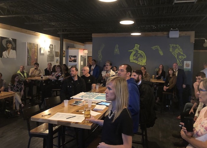 About 50 people gather at Hidden Springs Ale Works for an Urbanism on Tap workshop on the future of the Yellow Brick Row Business Association.