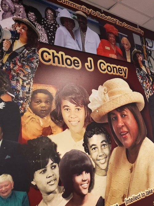 The legacy wall honoring Chloe Coney depicts images from Tampa's history over the last 70 years. It was created by Artist Ersula K. Odom.