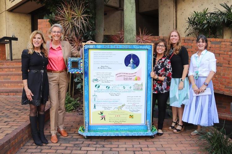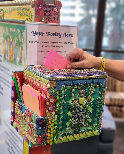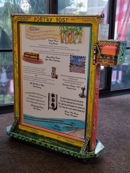 The structure of the Poetry Post is set up like a moving billboard on wheels, with some selected poetry from the contest along with Tampa-inspired imagery. A small ornate box on the side of the billboard is where the community can submit their own poetry as the Poetry Post at scheduled events where it will be at throughout the community.