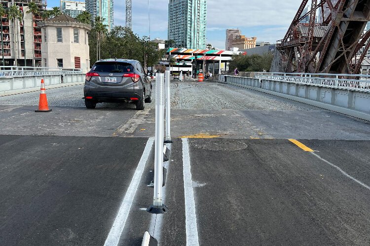 Provided by City of Tampa – The City of Tampa has installed barriers along the Cass Street Bridge to separate vehicle and bicycle lanes.