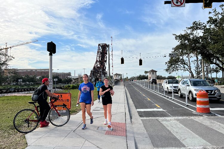 Along the Cass Street Bridge in downtown Tampa, a wide sidewalk accommodates pedestrians and barriers separate bicycle and vehicle traffic.