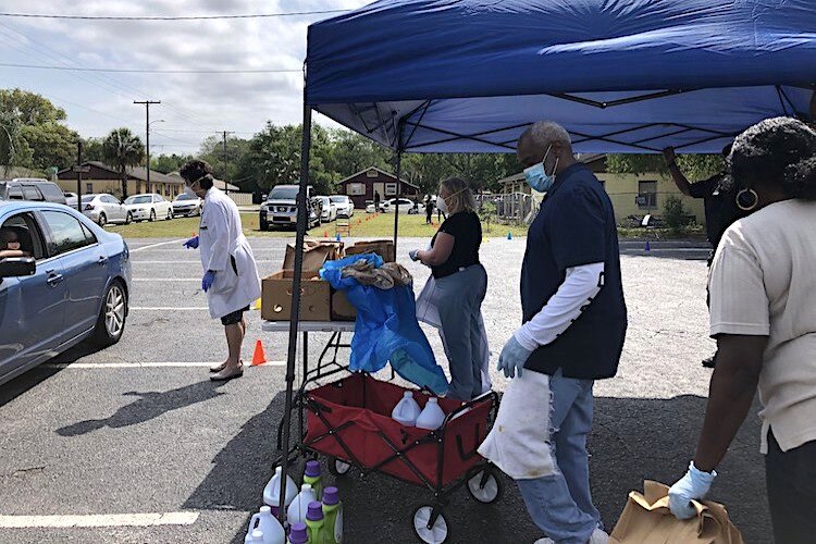 Courtesy of USF College of Nursing – USF College of Nursing staff and volunteers from the Abundant Life Church provide car-side pickup following social distancing guidelines. Approximately 50 families attended the event to receive essential groceries and household items.