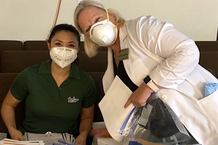 Courtesy of USF College of Nursing – Ann Joyce and Marcia Johansson from the USF College of Nursing behind their COVID-19 PPE at the April 17 event supporting Sulphur Springs families at Abundant Life Church.