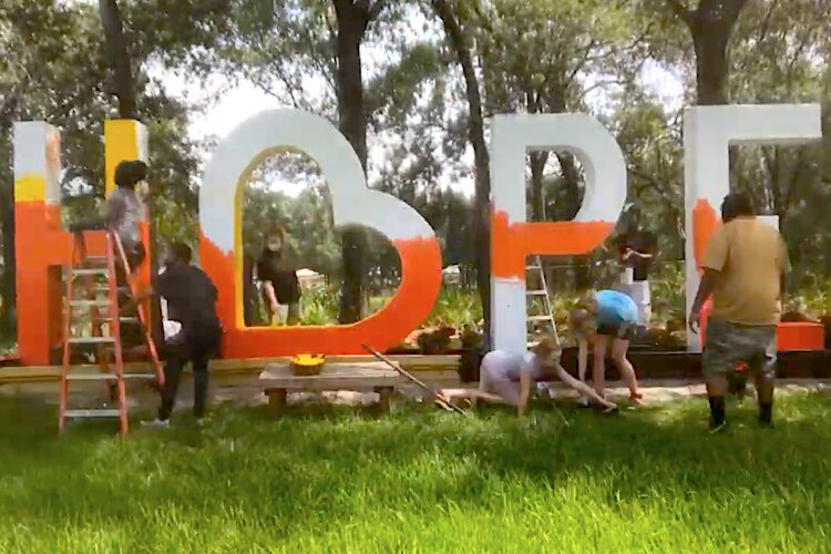 Artist Junior Polo, Prodigy Cultural Arts® students, and University Area residents helped paint letters spelling HOPE for a sculpture located in Harvest Hope Park in Uptown Tampa.