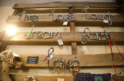 Colorful jewelry made from repurposed items hangs all over. Some are made from telephone wire. Others from deconstructed magazines and previously discarded items.