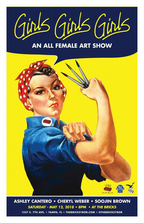 GIRLS GIRLS GIRLS is a new show (no, not that kind of show) coming to The Bricks Ybor on May 12.  In a 3-woman exhibition showcasing the works of Ashley Cantero, SooJin Brown, and Cheryl Cabbat Weber, the doors will be open from 8 p.m. – 3 a.m.