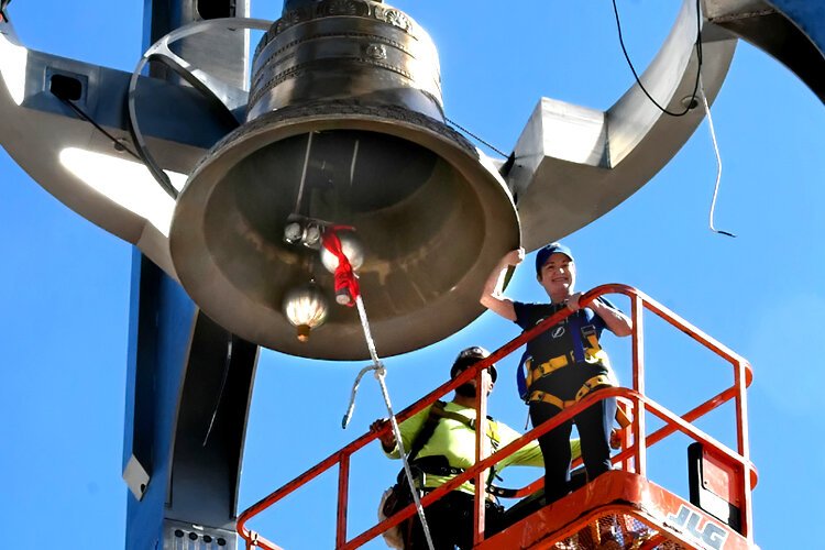 The University of Tampa’s Ars Sonora musical bell sculpture is under construction on campus as part of the new Sykes Plaza next to the Sykes Chapel and Center for Faith and Values.