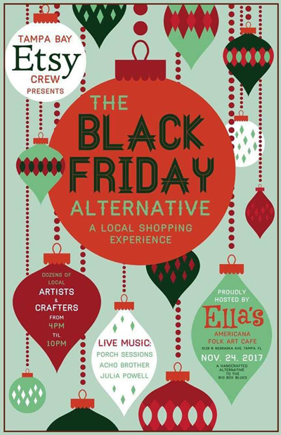 If you shudder at the thought of battling your way through the mall on Black Friday, why not check out “The Black Friday Alternative”? Hosted by the Tampa Bay Etsy Crew and Ella’s Americana Folk Art Café, browse through local makers (full list of artists on event page) to find some unique gifts for loved ones all while supporting local artists.