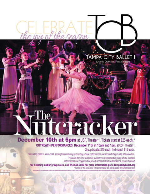 - Even if you already know the story, it’s still a staple of the holidays. Tampa City Ballet presents “The Nutcracker” at USF Dec. 10 at 6 p.m. for a one-night performance, so now’s the time to get crackin’ on your plans. Tickets are priced at $30.