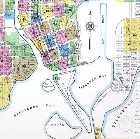 The rest of the approximately 160-acre property could be similarly described aside from the eastern end, which was known as the Estuary and consisted of low-lying land that occasionally flooded at extreme high tides. The Estuary land was at the center of a dispute between two rival railroads in the early 1900s and, through the efforts of U.S. Congressman Steven Sparkman, would become the western edge of the Ybor Channel and home to wharves and warehouses.