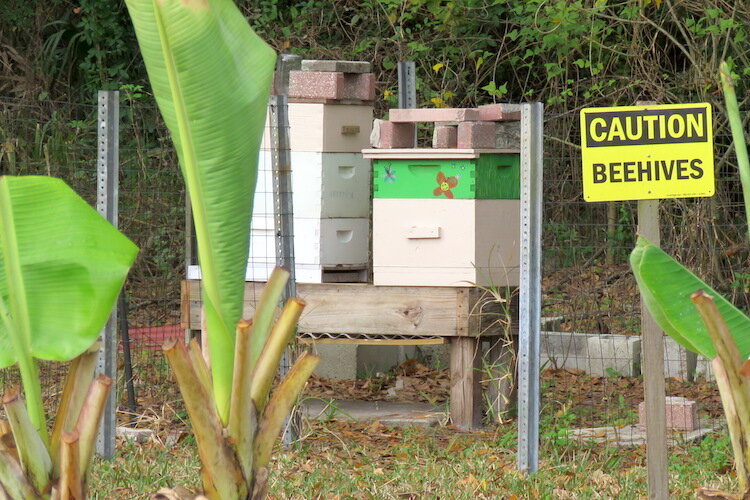 Not only do you need water and fertilizers to make things grow, you need bees. There are active bee hives off to the side of the garden. “The owner of the hives keeps the honey,“says Evenson, “but we get the bees to pollinate our gardens (along with Monarch butterflies). It’s a win-win situation.”