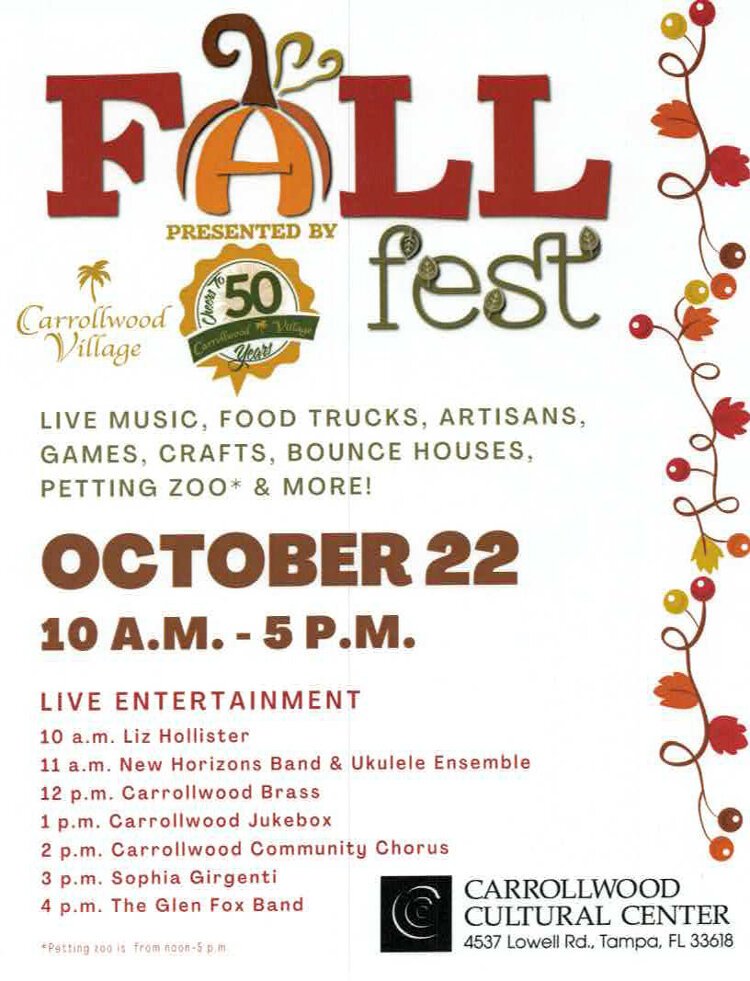 The fall fest and 50th-anniversary celebration is scheduled for 10 a.m.- 5 p.m. Saturday, October 22nd at the Carrollwood Cultural Center, 4537 Lowell Rd. Tampa. There will be live muscial entertainment from local acts like Liz Hollister and the Glen Fox band as well as performances by Carrollwood Brass, Carrollwood Jukebox and the Carrollwood Community Chorus.