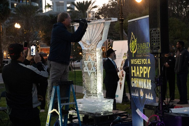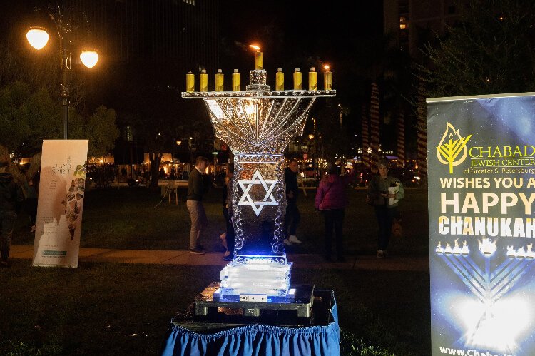 Just after sundown on Sunday, December 18th, a large ice menorah is lit in downtown St. Petersburg’s South Straub Park to mark the beginning of Hanukkah.