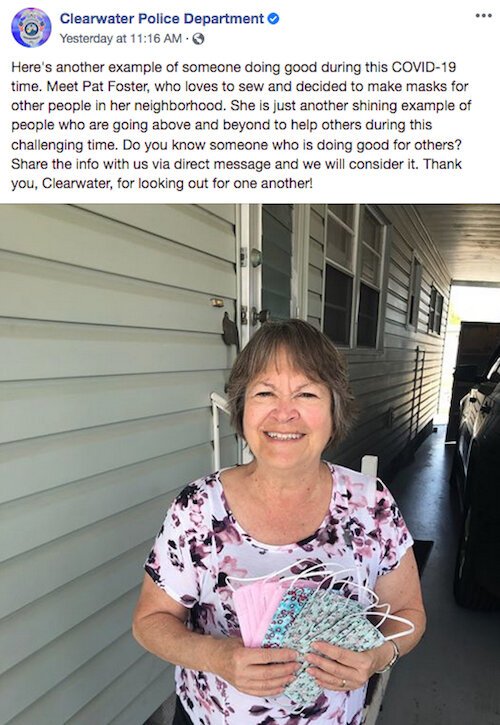 The Clearwater Police Department praised Pat Foster, “who loves to sew and decided to make masks for other people in her neighborhood. She is just another shining example of people who are going above and beyond to help others during this challenging time.” The department’s social media team is asking for information to share on Facebook about local heroes who are “doing good for others.”