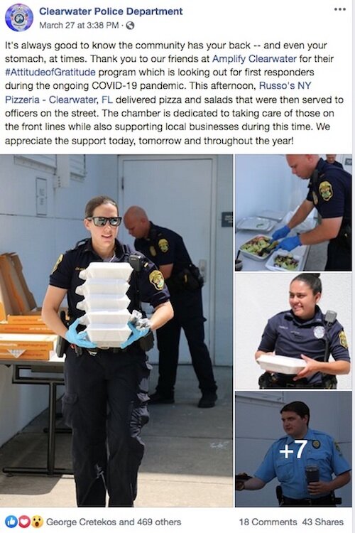 Clearwater’s fire department and police department have been working overtime to provide public service announcements and salute local businesses on their respective Facebook pages.