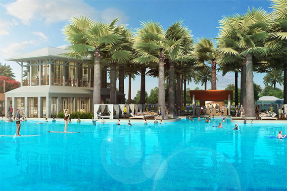 This 7.5-acre water body will employ Crystal Lagoon’s patented water purifying and clarifying technology to provide a safe swimming and kayaking recreation area more than six football fields long. Crystal Lagoons use a pulse disinfection system that puts small amounts of chemicals where they are needed at the appropriate time, and an ultrasonic filtration system that sends out sound waves to make particles in the water flocculate (form into small clumps or masses).