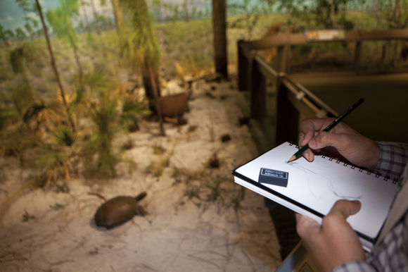 “Digging up the history was fun. I knew it was important, but the real question was how to make it believable and specific to the Bradenton riverfront,” Brandes says. “I wanted to make sure that no one looked at my paintings and said, ‘Oh, that bird doesn’t live here,’ or ‘Oh, that plant doesn’t grow by the seawater,’ or ‘That’s a ceremonial urn, not a water jug.’ ”