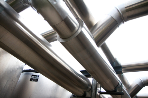 The process works with enormous chillers — two are in place already, each capable of processing 1,000 tons of water (an even larger, 2,500-ton chiller will be added as the development progresses) — that make ice when electricity is not at a premium, for instance at night, and are stored in 51 steel ice tanks. The ice is then melted to cool the buildings as needed.