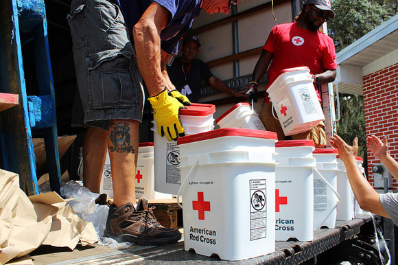 Courtesy of American Red Cross – American Red Cross volunteers distribute limited supplies as Hurricane Irma approaches in 2017.