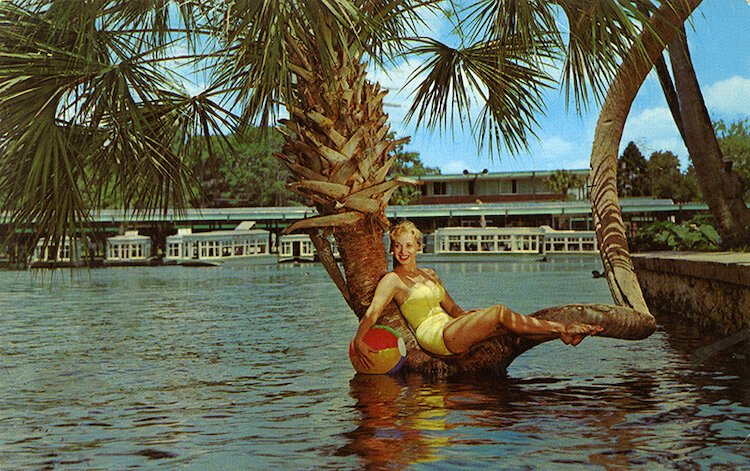 Yet the TV tray/brochure image is not the most iconic and unusual image taken at Silver Springs. That distinction belongs to a photo of Betty actually perched on the tree inches above the river. She holds a beach ball and appears to be comfortable, if not actually languishing, in the curves of the palm — truly a good-looking girl doing something unusual. The horizontal format became a popular postcard that simultaneously featured an exotic and contorted tropical palm, a beckoning bathing beauty, and the Silver Springs attraction.
