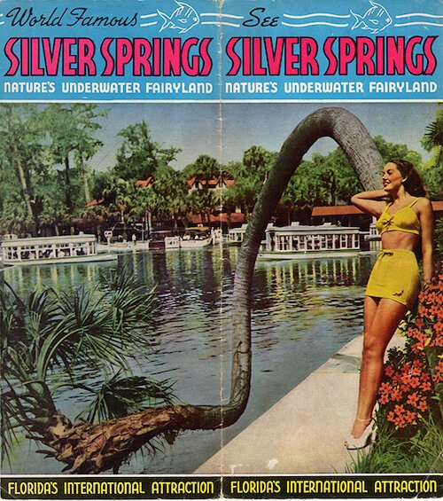 As far as Google and eBay know, there is only one genuine Silver Springs TV Tray. Its clattering pressed-tin surface perched above its precariously scrawny wire legs features a dry-land photo taken by Mozert, and, as you might expect, it also features a cabbage palm. A brunette Silver Springs model poses in a modest yellow two-piece swimsuit standing on a sidewalk in white heels and appears to be leaning on a cabbage palm trunk that has taken a parabolic dive toward the Silver River. The famous glass-bottomed boats can be seen in the distance. The strong vertical format of this half of the image destined it to grace untold numbers of Silver Springs brochures. When one unfolds the brochure, the palm canopy appears suspended over the river.