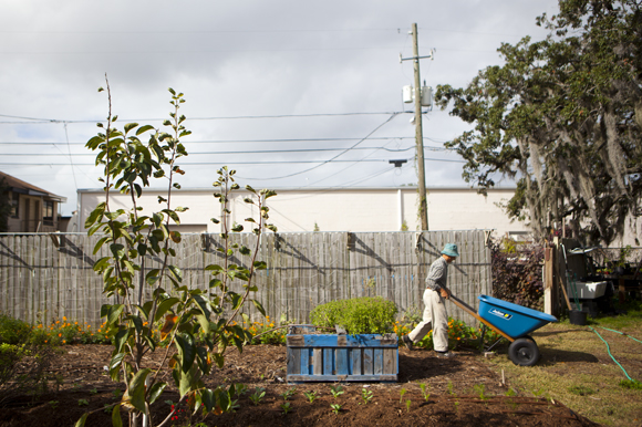 Today, that half-acre of land in the heart of St. Petersburg’s urban core has been transformed. Fennel, beets, pole beans, basil, tomatoes, broccoli, collards and more are growing in long trenches watered with drip irrigation. Tropical trees like papayas, loquat, limes, star fruit and avocado are thriving. Scraps of wood from boat docks and pallets have been repurposed as tool sheds, while donated bricks were turned into a courtyard event space for gardening classes. Several rabbits and a few dozen chickens live there, too.