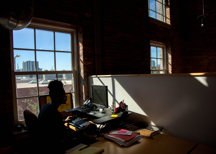 Managing attorney Karina Perez enjoys working in the 2,000-square-foot office the Vanguard team calls home. “I previously worked in a high-rise downtown,” she said. But the cubicle life wasn’t for her, and she was drawn to the rustic, yet airy first-floor quarters on the west side of the Florida Brewing Company building.