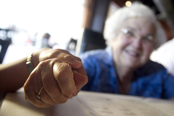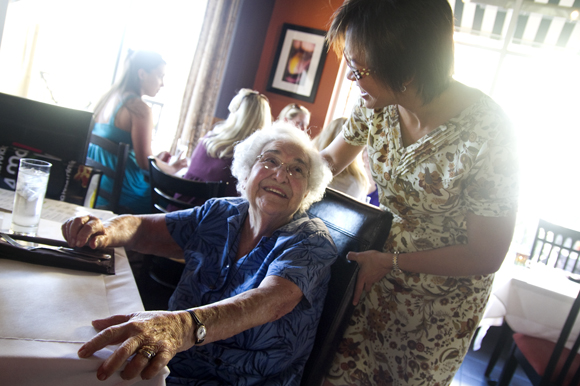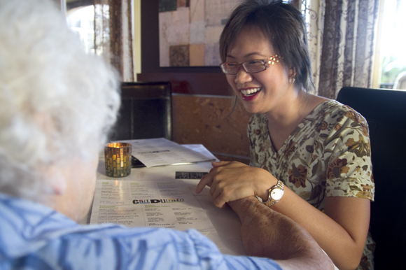 Somboonwit carefully helps Sanchez navigate her way among the tables and chairs to the restrooms at the back of the restaurant – gingerly and gently, with no sign of impatience. She simply waits for her friend to take each step and offers an outstretched arm when she needs it.