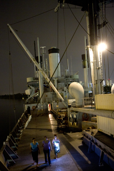 Sharpe pointed out the large cargo holds that open up on the deck and stretch about 30 feet down into the hull of the ship. Large cranes filled these cargo holds from the bottom up with equipment and supplies. A fall from the deck to the bottom would be fatal.