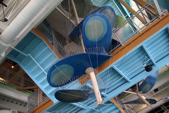 A showpiece linking the first and second floors is a 30-feet-high climbing structure called Water’s Journey, where children can mimic a drop of water traveling from clouds to the aquifer and back. The exhibit is a network of 39 platforms supported by about 6 miles of cable. It’s suspended from the ceiling around a stairwell. Parents will appreciate that they can see all the entry and exit points in the structure to identify where their child is while inside, Shimberg says.