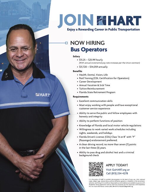 Transit services on both sides of Tampa Bay are hiring. The Pinellas Suncoast Transit Authority is looking to hire some 85 to 90 drivers during the next 10 months and HART is recruiting some 50 bus operators.