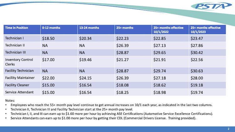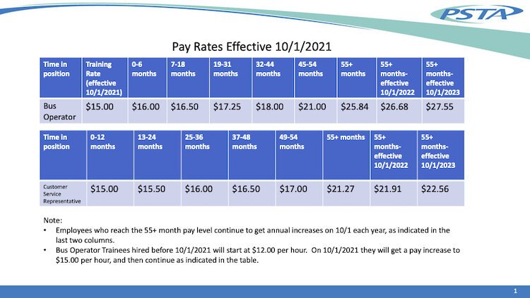 PSTA has renegotiated pay rates with the Service Employees International Union, which represents bus operators, mechanics and other front-line workers. Under a new three-year contract, wages increase to $16 an hour for trained workers starting October 1. After six months, pay rises to $16.50 an hour; wages are guaranteed to climb to $27.55 within four and a half years.