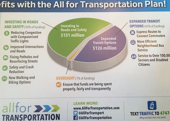 About 54 percent will go toward improved roads; about 45 percent will go toward mass transit, including better bus service.