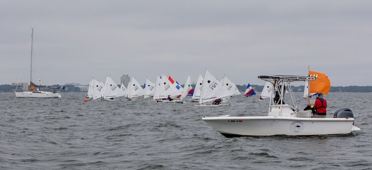 Twenty-one Clearwater pram boats were stationed first, just beside the International Optimist boats, and the 62 Sunfish boats settled further out on the horizon. Quick glimpses of the sun illuminated the choppy water as it splashed up to the front of the spectator boat, moments before the radio proclaimed, “we just recorded 11 knots.” Spectator boats were stationed close enough to the Sunfish sailors to get a great image, but not too close as to obstruct the race.