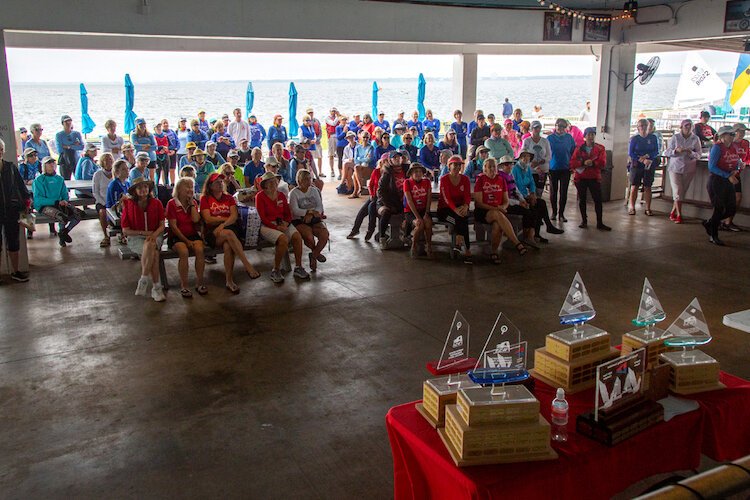 On the recent early morning of a women’s sailing race, small trailers hitched to the back of cars and square pram sailboats lined the pathway. Participants of all ages, the youngest 28 and the oldest 87, sported their sailing gear adorned with their team names. Their rubber boat shoes paced around the grounds of the club as they searched for their teammates and embraced fellow sailors with excitement and conversation.