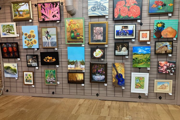 “Cheryl’s art career began in 2021 when she became interested through videos of artists Olga Solby, Molly Leach and Rinske Douna,” an exhibit description says. “Cheryl discovered the calming effects of the various pouring techniques of these talented artists and began
