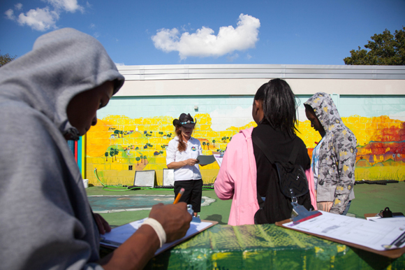 “She asked us if we would be interested in making a mural and putting the Fuel Up logo on the wall. We started in April and finished 6 months later, but it was really hot out there! We started brainstorming to see how we could use art as a way of learning different kinds of art to have mini lessons, like learning perspective, since they don’t have an arts program. Art is really great for confidence building and motor skills, and a way to open your inner self, ” Straub says.