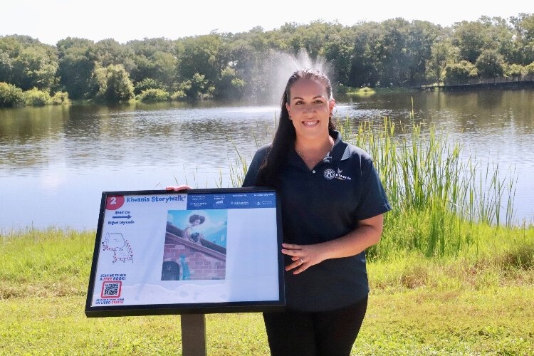 Amanda Malinowski, chair of the Kiwanis Club of Tampa StoryWalk program, with a story page at Carrollwood Village Park.