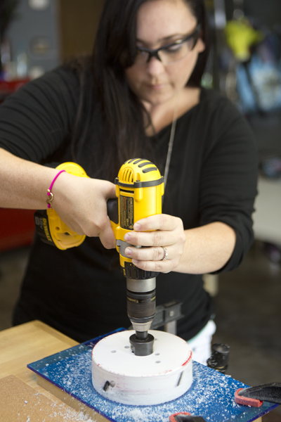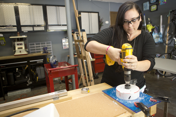 Like any self-respecting start-up, her workshop is her garage. There, she masters her set of tools from a butane blowtorch to the radial arm saw for making perfect circles for the food and water bowls to her acrylics-molding line-bender “at least that’s what I call it,” she explains.