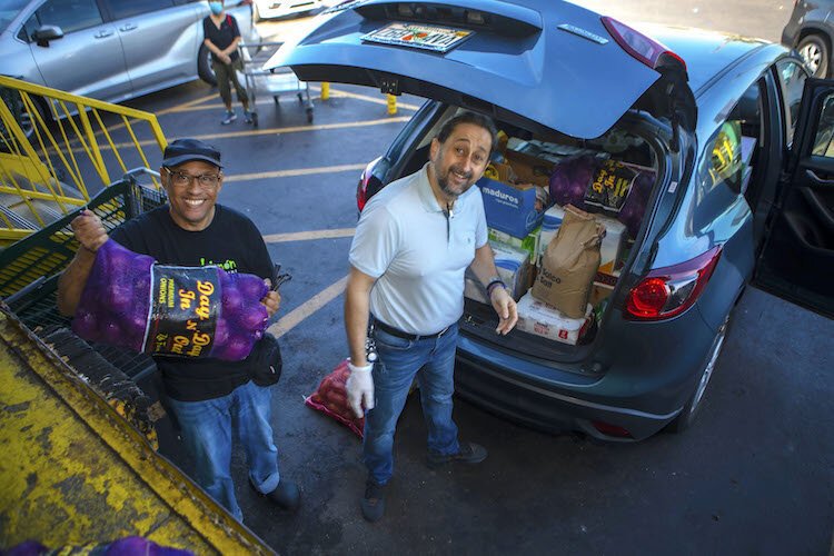 Photo by Kimberly DeFalco – Al Mora, right, proprietor of Lima Limo’ne Peruvian Cuisine on Busch Boulevard, loads his car several times a week with fresh fruits, vegetables, and restaurant supplies.
