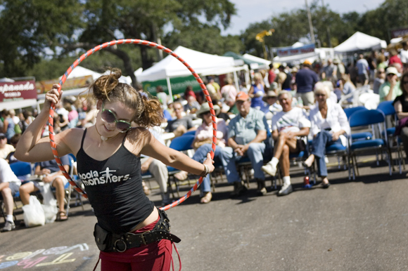 Between bites, she waves the ear around like a pointer. She points out the craft booths, the food vendors, the crowds coming in from the all directions.