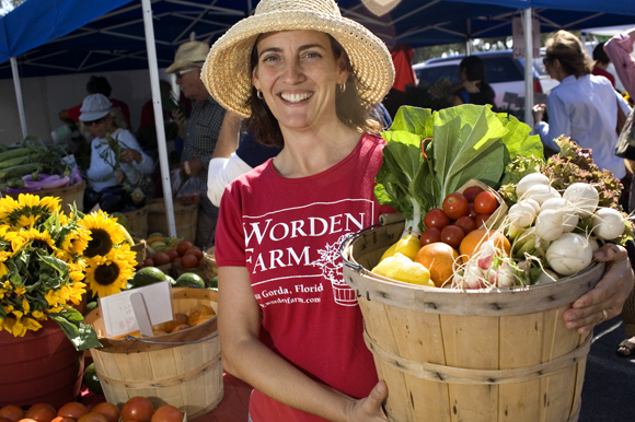 At the next booth are the farmers from Sweetwater Organic Farm in Tampa. Beyond that is Eggeman’s newest vendor – Worden Farms. She boasts that Eva and Chris Worden run Florida’s top organic farm.