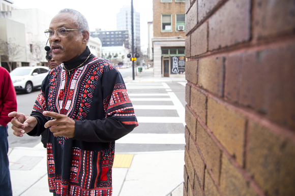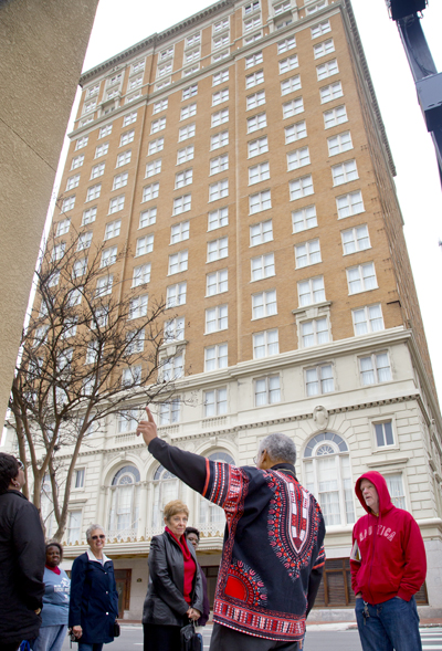 Walking past Cass Street, Hearns points out the Floridan Hotel.