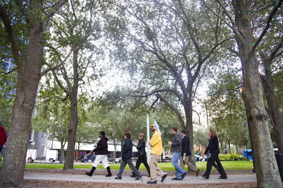 The route starts at Lykes Gaslight Park across from the Old Courthouse Square, now the Tampa Police Department. About 25 listeners walk north along Franklin Street to Fortune Street, then south along Florida Avenue.