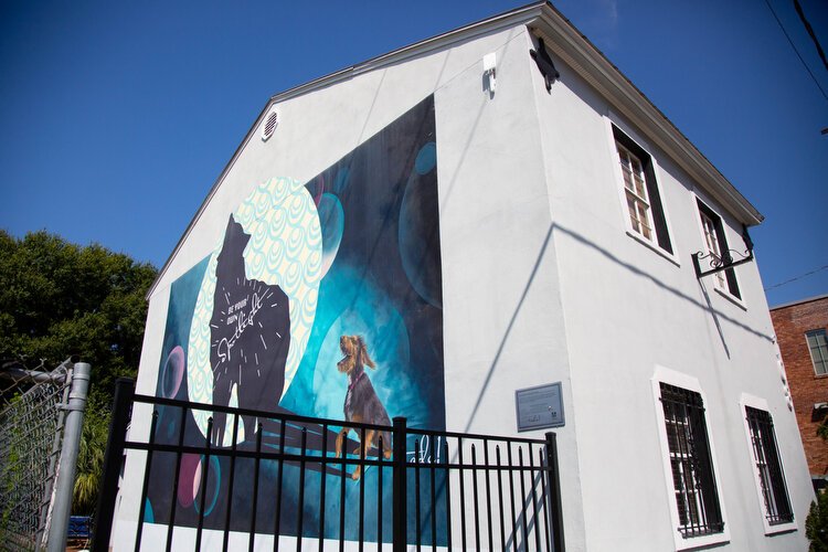 Farrell Scalise painted “Be Your Own Spotlight” as a message about life writ large on an outer wall of Farrell Scalise’s home. A small dog shows his inner courage as he howls and casts the shadow of a much larger wolf-like animal.